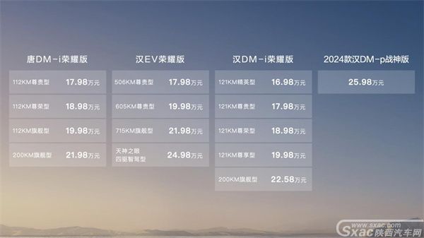 此次发布,汉EV荣耀版携4款车型,价格区间为17.98~24.98万元;汉DM-i荣耀版则带来了5款选择,售价范围在16.98~22.58万元;而备受瞩目的2024款汉DM-p战神版,以单一车型25.98万元的价格,展现了其不凡的定位;唐DM-i荣耀版同样令人瞩目,4款车型定价在17.98~21.98万元之间。