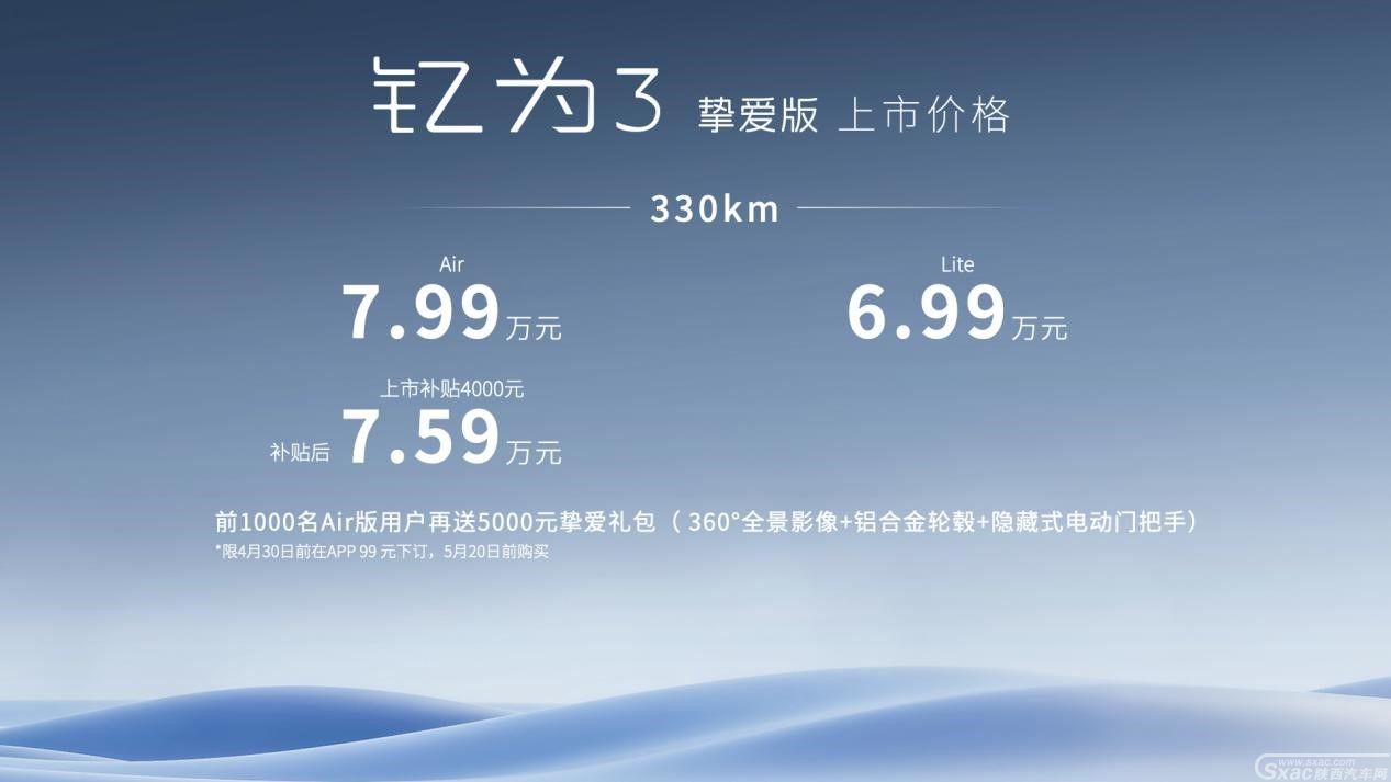 新增330km续航版型的钇为3挚爱版,价格来到了7万元-12万元区间,降低用户入手门槛的同时,在实力与品质上再次进化。作为全球首款真正意义上基于纯电平台打造的A0级车,"超安全智电守护者"钇为3挚爱版凭借MAX级的产品力,带给更多用户"智能、安全、愉悦"的出行体验。