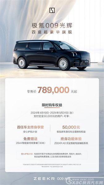限时购车权益:从2024年4月19日至2024年5月31日(含),支付50,000元定金的极氪009光辉新车首任非营运车主,可终身享受「安心护航计划」,包括但不限于车辆全生命周期的免费保养,雨刮片、制动片、制动盘等免费更换,以及无限次维保取送车(细则详见公告)。极氪新车首任车主(限已提车),于2024年5月31日(含)前购买首台极氪009光辉,可享受50,000尾款抵扣。同时,极氪009光辉车主均享有20kW智能家充桩套餐(30米)权益,并可免费升级ZEEKRAD完全智能驾驶辅助系统终身功能体验(详情可参见极氪009光辉上市公告)。