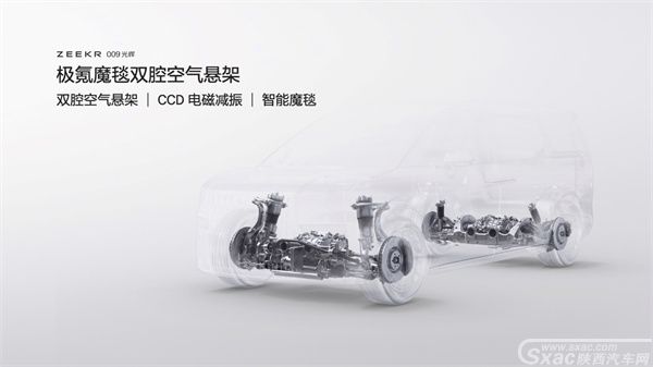 极氪009光辉搭载「极氪式操控」的最新科技--极氪魔毯双腔空气悬架,在CCD电磁减振和双腔空悬组成的主动式悬架基础上,加入「智能魔毯」功能,将车辆底盘域、智驾域打通,利用车载主动感知系统,以及感知和决策算法,智能识别障碍物,实现悬挂软硬的毫秒级调节,成为全球底盘响应速度最快的四座MPV,极致舒适媲美百万级超豪华车。
