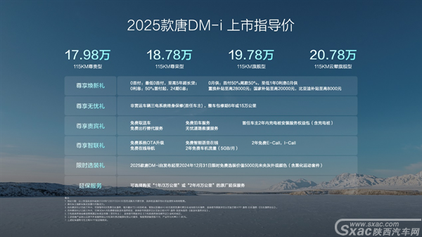 此次,2025款唐DM-i共推出4款车型,售价17.98万~20.78万元。同时,比亚迪为用户准备了包括“尊享焕新礼、尊享无忧礼、尊享贵宾礼、尊享智联礼、限时选装礼、延保服务”六重购车礼遇。