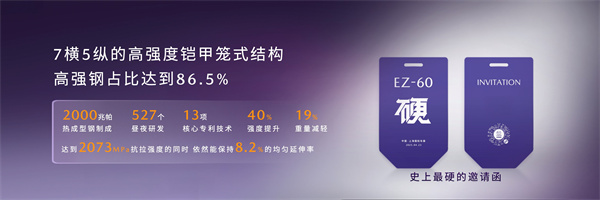 EZ-60延续了马自达在安全领域的核心DNA。发布会上,长安马自达汽车有限公司执行副总裁邓智涛向参展嘉宾展示了"史上最硬的车展邀请函"--它以2,000MPa的热成型钢制成,取自EZ-60的车身,历经527个昼夜研发,包含13项核心专利技术,在达到2,073MPa抗拉强度的同时,依然能保持8.2%的均匀延伸率,强度提升40%,重量减轻19%,这块特殊的邀请函象征着长安马自达在安全领域追求极致的坚定信念。