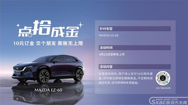 【陕西汽车网讯】4月23日,长安马自达MAZDAEZ-60(以下称EZ-60)在2025上海国际车展正式迎来全球首秀。作为长安马自达全面转型新能源时代的战略级之作,EZ-60以全面进化的「魂动」美学设计、超愉悦AI智能座舱、电感「人马一体」驾控、全球顶级的主被动安全性能,重新定义电动时代的智电豪华出行新体验。即日起,国内消费者可通过长安马自达官网、「悦马星空」官方APP/小程序,以及授权经销商预订新车,订金10元,每天膨胀,膨胀不封顶,直至新车交付,膨胀金直接抵扣车款。