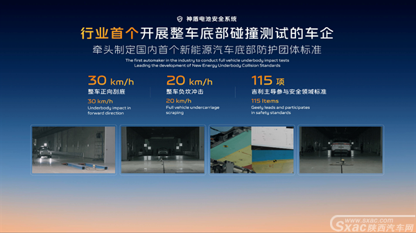 神盾电池安全系统在行业内第一个做到30km/h托底冲击、20km/h整车负坎冲击都无损伤,解决电动车最怕的因底部碰撞带来的电池损伤和安全事故。早在2021年,吉利就携手国家权威机构,牵头制定了国内首个新能源汽车底部防护的团体标准。将于2026年7月1日起施行的《电动车用动力蓄电池安全要求》,也新增了电池底部撞击等测试标准。截至今年3月,吉利主导参与安全领域的各项标准已达115项。