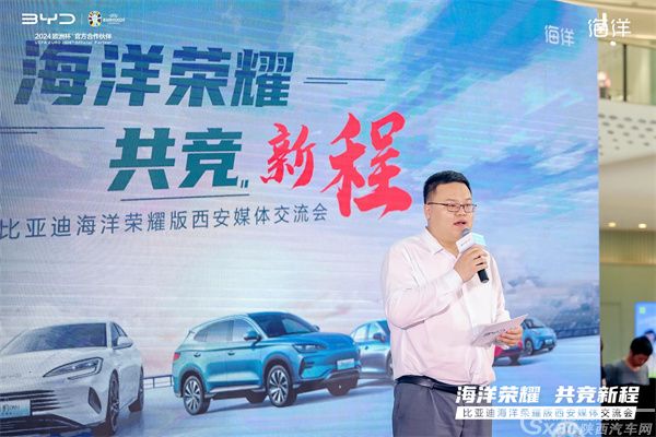 比亚迪海洋网陕甘宁战区陕南大区大区经理杨斌先生登台致辞,他表示比亚迪海洋网荣耀版车型的推出,彰显了比亚迪全面践行"电比油低"、推动新能源迭代合资燃油的决心,以及引领出行体验向更高价值进阶的底气。