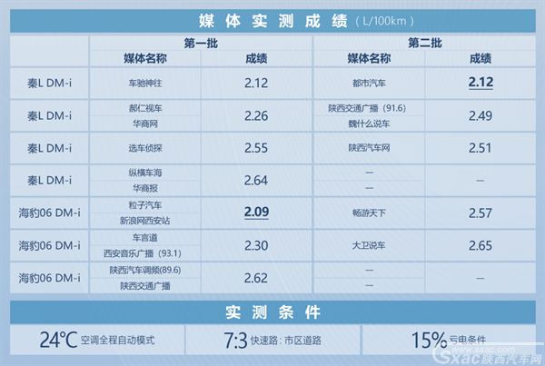 本次解析会同时举行了秦LDM-i和海豹06DM-i百公里亏电油耗实测。日常通勤怎么开就怎么测,城市快速路占比70%,市区道路占比30%,全程空调自动开启24℃,SOC亏电条件不低于3%,最终西安站油耗实测成绩全部低于2.7L,再次印证了第五代DM技术的真实力,从省油、技术、设计、空间、驾乘、智能、安全各个维度,引领行业,开创油耗2时代!