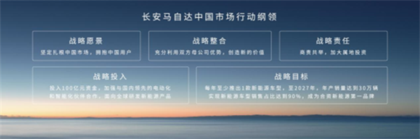 战略愿景,坚定扎根中国市场,拥抱中国用户。基于中国市场的电动化和智能化创新成果,坚定推进长安马自达新能源转型,深度融合马自达核心DNA,构建电动化时代的核心竞争力;二、战略整合,充分利用长安、马自达两家百年车企优势资源,夯实全新的合作模式,加强内部业务协同,提升资源共享水平,持续创造新价值,实现高质量可持续发展;三、战略投入,面向2027年,在新能源领域累计投入100亿元,不断加大人才、设备领域的投入,加强与国内领先的电动化和智能化伙伴的战略合作,培育面向全球的新能源产品开发能力;四、战略目标,2024年开始,每年至少向中国市场推出1款新能源车型,不断扩大轿车、SUV细分市场覆盖。2027年力争实现新能源车型销售占比达到90%,年产销量达到30万辆,成为合资新能源第一品牌;五、战略责任,切实履行在中国市场的企业社会责任,提升长安马自达企业、品牌参与者的幸福感。加大属地投资,吸引更多产业配套落户。在南京工厂200万辆累计产销基础上,向下一个200万辆产销周期持续迈进。