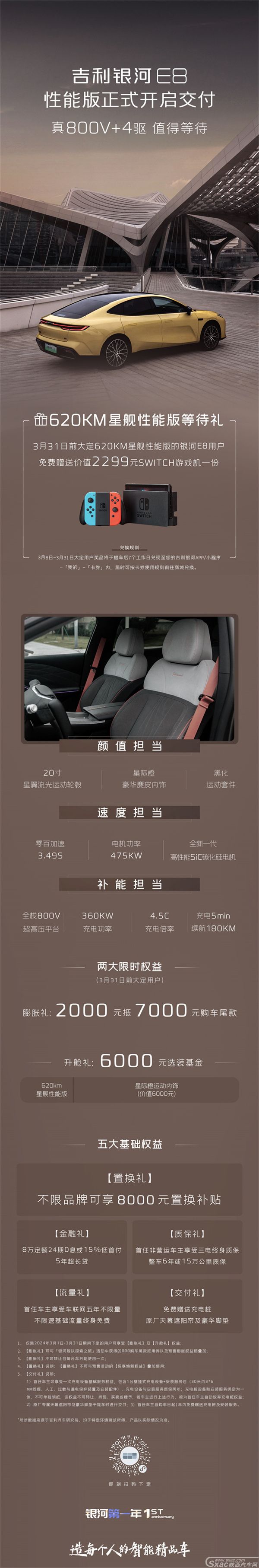近日,多家车企接连宣布促销或限时优惠,利好有购车需求的消费者。吉利银河E8为了回馈广大消费者的厚爱,现推出限时购车政策。3月31日前大定620KM星舰性能版的银河E8用户,免费赠送价值2299元SWITCH游戏机一份,同时享有两打限时和五大权益: