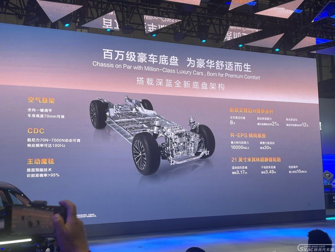 深蓝S09将高端配置“年轻化”:43英寸AR-HUD抬头显示、20扬声器7.3.4全景声系统(2232W功率)、10L车载真冰箱(-6℃至50℃宽域温控)等配置下放,打造“移动豪华客厅”;7面双层隔音玻璃+ANC主动降噪,高速行驶噪音仅56分贝,媲美百万级豪车静谧性;底盘采用前麦弗逊+后多连杆结构,搭配“不晕车智能悬架”,通过实时阻尼调节,减少30%颠簸感,老人小孩长途乘坐更舒适。