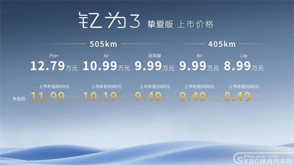 新增330km续航版型的钇为3挚爱版,价格来到了7万元-12万元区间,降低用户入手门槛的同时,在实力与品质上再次进化。作为全球首款真正意义上基于纯电平台打造的A0级车,"超安全智电守护者"钇为3挚爱版凭借MAX级的产品力,带给更多用户"智能、安全、愉悦"的出行体验。