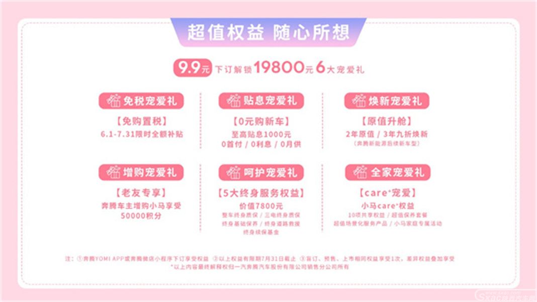活动现场,一汽奔腾重磅宣布,6月1日后购买奔腾小马,官方限时全额补贴购置税。同时,超多宠粉权益一并揭晓,9.9元下订即可享受价值19800元6大宠爱礼,用户购车无负担、日常用车更轻松、后续换车更保值。