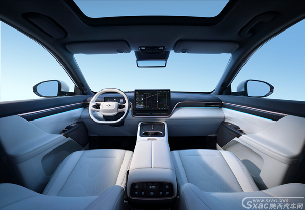 仪表台整体用大面积柔软亲肤皮质包覆,视觉中心采用仿麂皮面料的独特肌理,座舱和全车座椅,覆盖远山近水的打孔纹理,座椅靠背采用国风刺绣工艺,精致细节,无处不在。