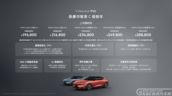 【2024年9月5日,杭州陕西汽车网讯】今日,新豪华智享C级轿车领克Z10在杭州正式上市,上市限时价19.68万元起,提供5款版型,以满足不同用户的多元需求。作为领克首款纯电C级轿车,领克Z10拥有一眼可辨的领克范、超越同级的舒享空间,承袭领克操控基因,搭载全球顶级算力车机系统,同时采用路特斯机器人提供的高阶智能驾驶方案,为用户带来前所未有的纯电出行体验,也从设计、空间、智能、操控、安全等多个维度,重新定义了C级轿车价值标准。