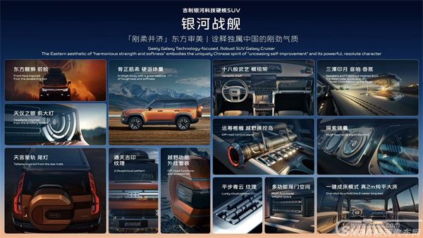 发布会上,吉利智能安全科技的集大成者--银河战舰迎来全球首发。银河战舰在设计上不仅展现了"刚柔并济"的东方审美,更诠释了独属于中国人"自强不息"的刚劲气质。形似"浑天仪"的前大灯、勾勒"天宫星轨"的尾灯,灵感来自"游艇操纵杆"的越野操控岛等设计等,均展现了吉利银河"涟漪美学"在智电时代的硬派表达。
