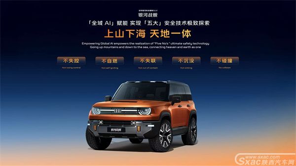 此外,银河战舰承载着吉利对"不失控、不自燃、不失联、不沉没、不碰撞"五大安全技术的极致探索。"满血版"AI数字底盘,让银河战舰拥有蟹行、原地掉头、爆胎行驶等技能,还能实现"无人漂移",吉利自研的GVMC车身稳定系统,让银河战舰实现80km/h麋鹿测试速度,在硬核SUV中全球第一。银河战舰搭载的"神盾金砖电池",搭配拥有10倍耐磨、抗冲击能力的防弹涂层,就像给电池穿上了防弹衣,保护电池电芯不变形、不起火、不爆炸。吉利独有的卫星星座,让银河战舰即使在无人区,也可以实现双向卫星通信。银河战舰配备了涉水雷达,以及行业独有的车载声纳,具备800mm的超高涉水能力,可连续浮水2小时,航行速度超过8.5km/h(4.6节)。