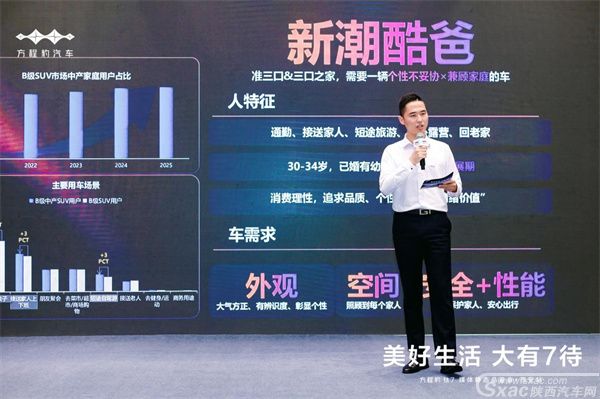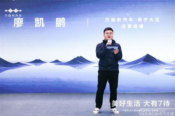 紧接着,方程豹汽车陕宁大区-运营经理-廖凯鹏登台致辞。他从方程豹的发展战略谈到钛7的市场定位,钛7,是方程豹"悦己宜家"精神的集大成者--既要满足个人的驾控激情,也要兼顾家庭的出行需求,让用户可以既不委屈自己,也不辜负家人。致辞中对用户价值的关注与对创新突破的坚持,让嘉宾们深刻感受到方程豹始终以用户为中心的品牌文化。